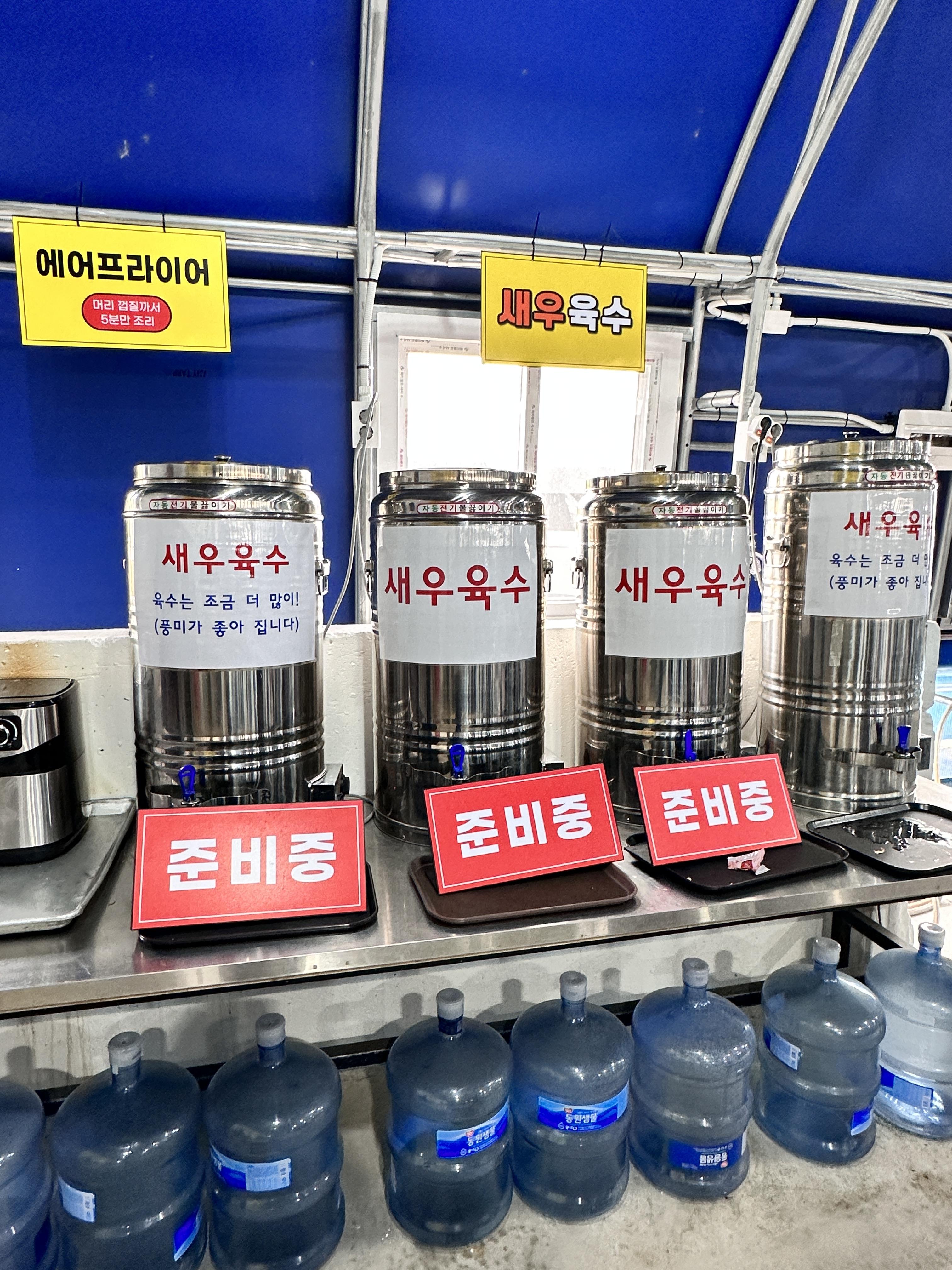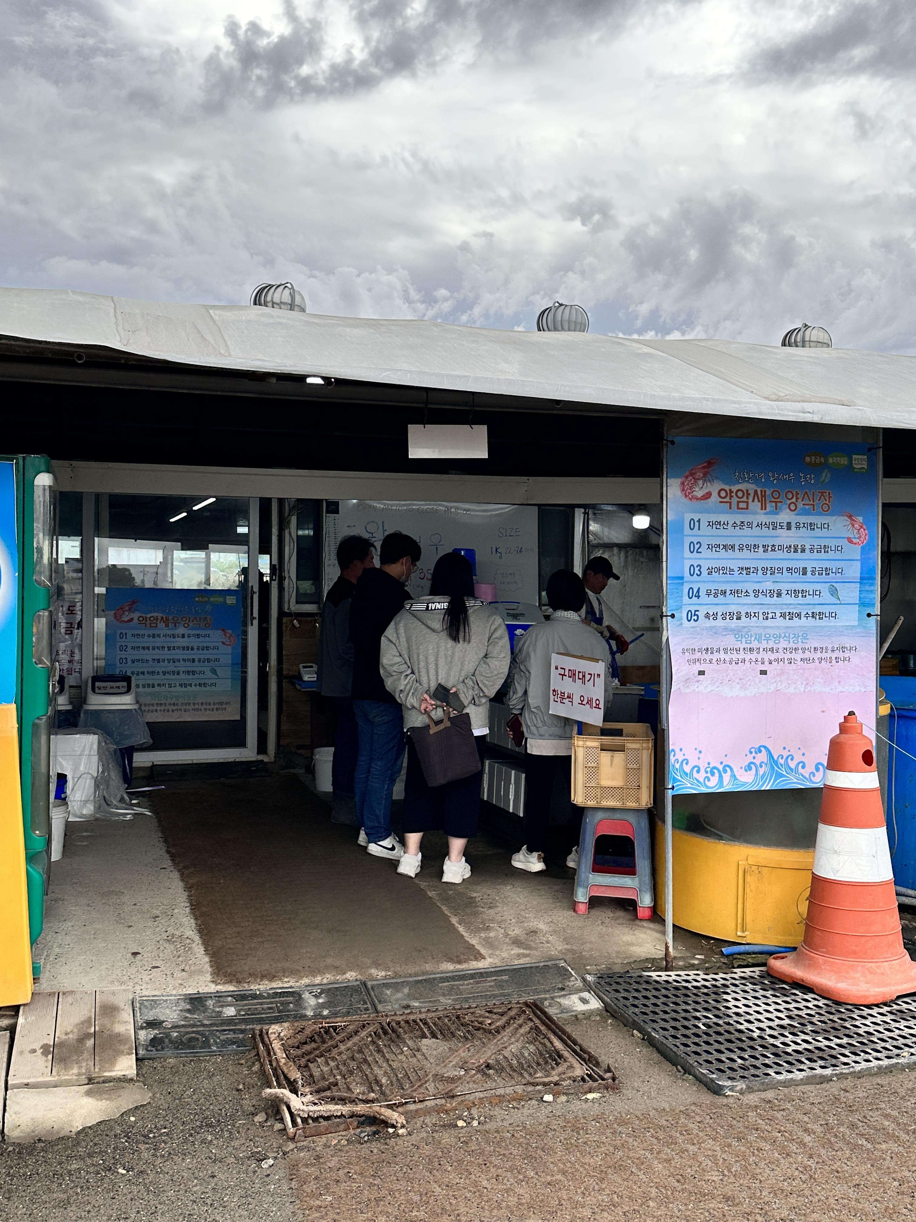 이름이 불리면 1명은 들어가서 자리받고 1명은 가서 새우를 사 오면 됩니다. 새우는 맞은편 건물에서 구입할 수 있어요