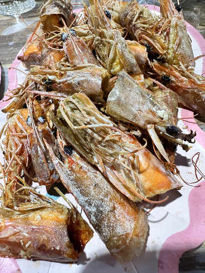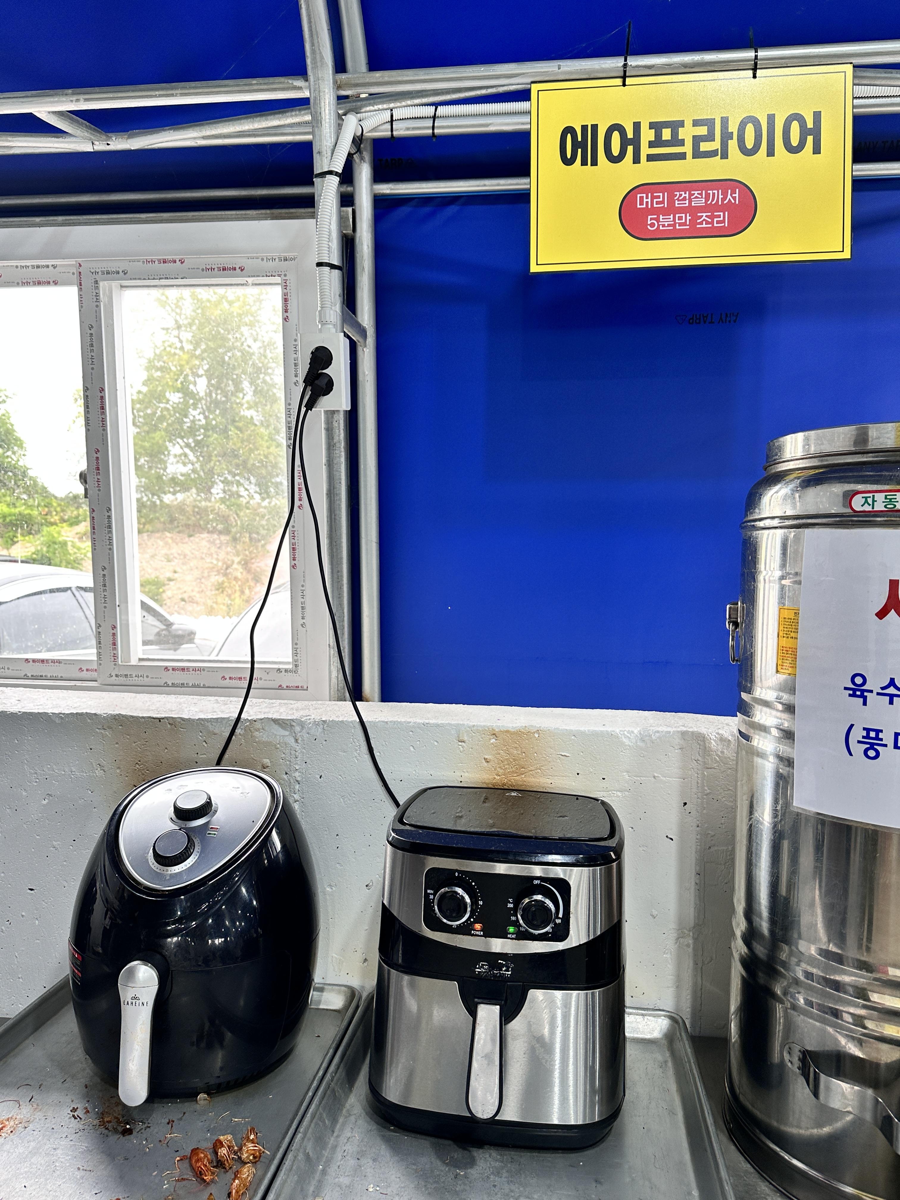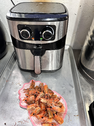 그리고 왕새우 머리는 뒤쪽에 마련된 에어프라이기를 이용하여 5분 정도 돌려주면 됩니다. 고소하고 바삭하게 준비된 새우 머리~ 맥주 한잔이 정말 너무 생각나더라고요. 다음에는 꼭 술을 준비해서 가야겠다 생각했어요