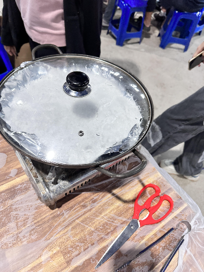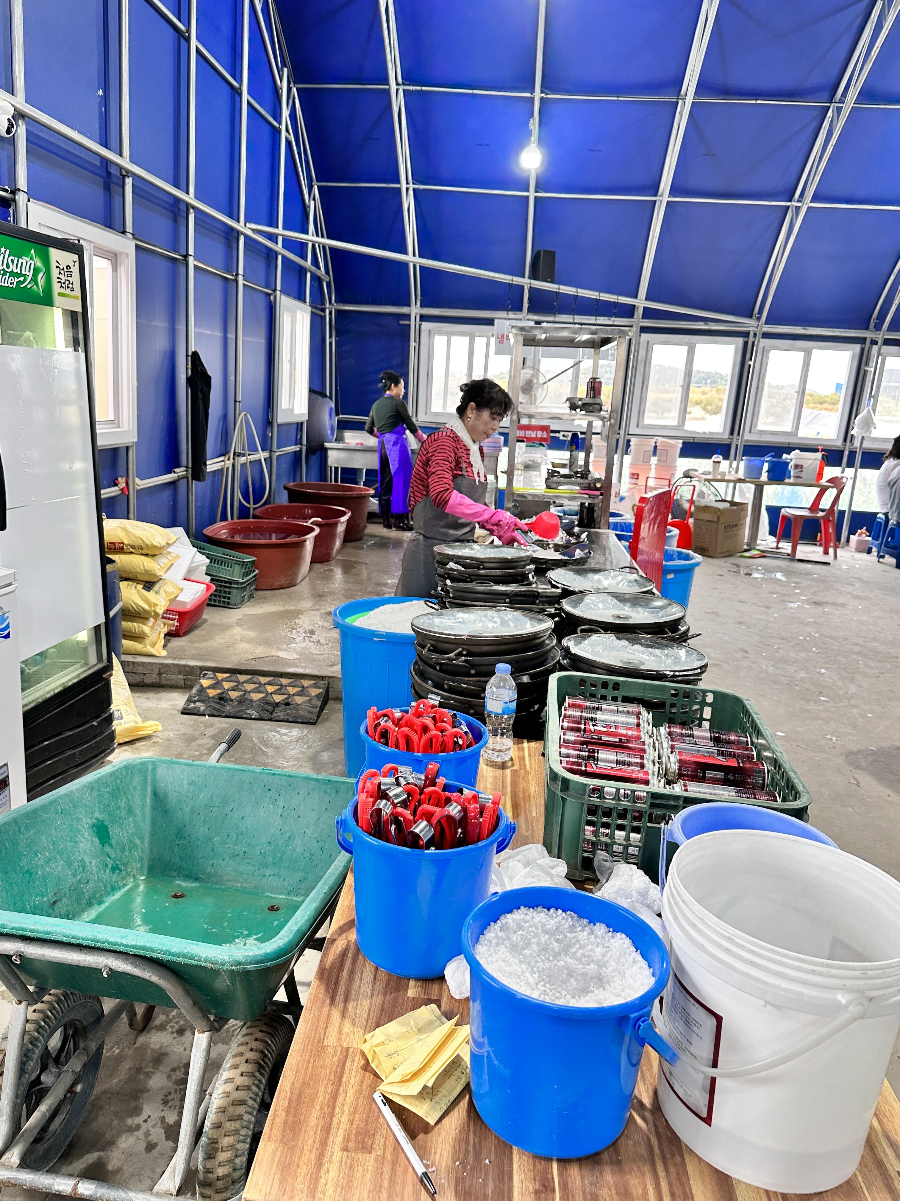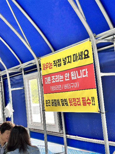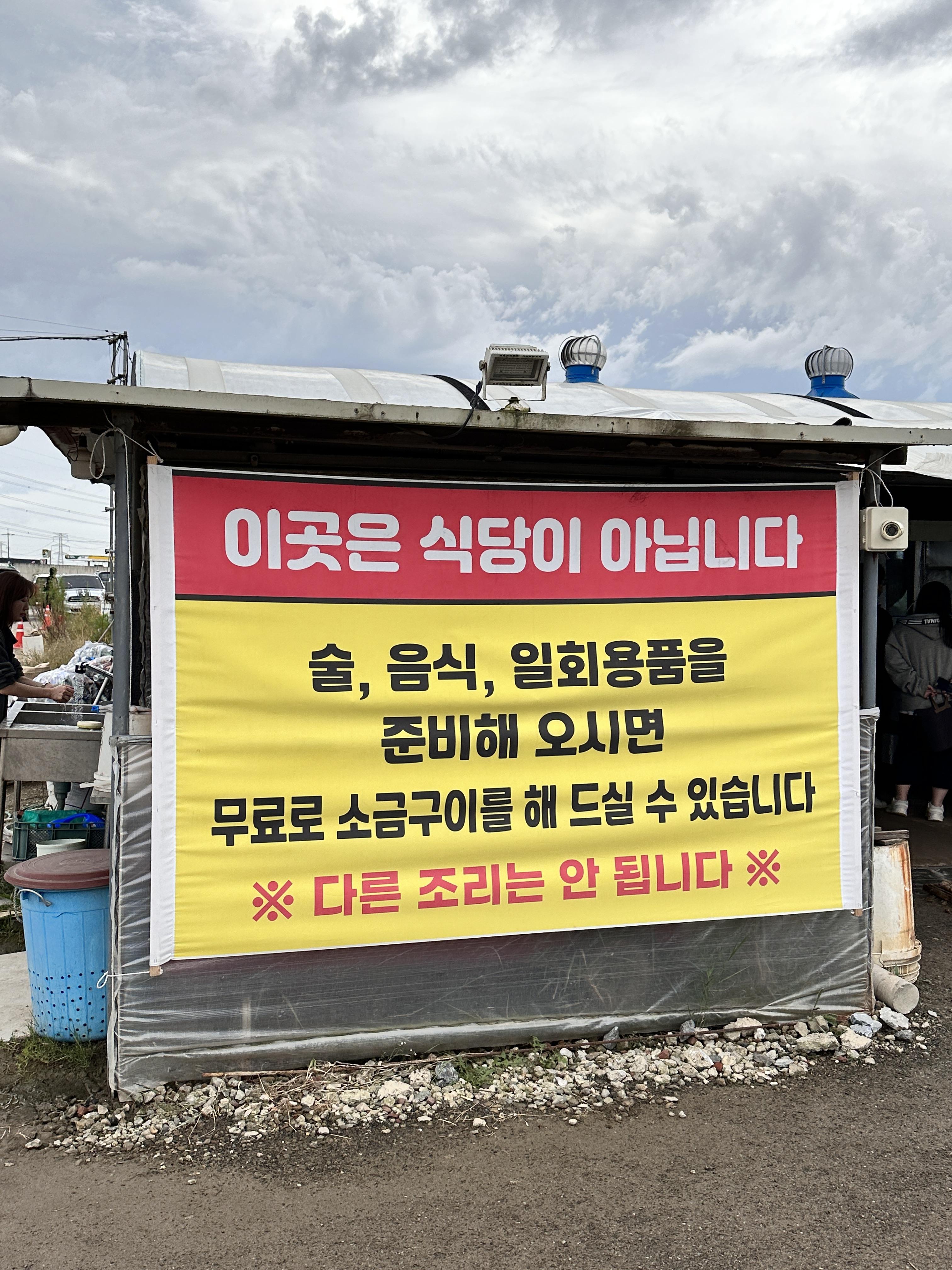 테이블에 가면 비닐이 하나 깔려있고 소금구이 가능하게 부르스타, 소금구이 냄비, 가위, 집게등이 준비되어 있어요. 그리고 새우는 직접 넣지 말라고 크게 표시되어 있어요. 넣을 자신도 없기도 했지만 관리해 주시는 분들이 해주시니 그건 정말 편했어요.