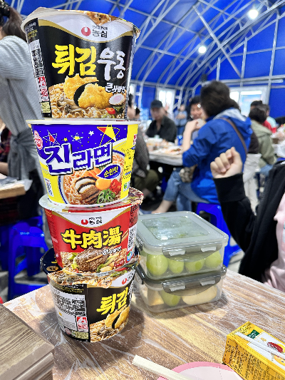 그럼 개인이 준비해 갈 것은 무엇이 있는지 알려드릴게요. 컵라면, 물, 음료 및 술, 나무젓가락, 일회용 접시, 컵, 목장갑, 초장 등...우선 컵라면이 필요한데요 끓이는 라면은 먹을 수가 없어요 조리가 불가능해요. 대신 컵라면을 가지고 오면 새우 육수가 따뜻한 보온 큰 통에 준비가 되어 있으니 이용하여 먹을 수 있어요. 음료, 술, 물은 개인이 지참해서 가지고 오셔야 되고요. 일회용 그릇, 젓가락 등 모두 준비하셔야 돼요. 그리고 저희는 워낙 과일을 좋아해 과일을 챙겼는데 옆 테이블에 보니 김치도 챙겨 오시고 밥도 많이 챙겨 오시더라고요. 기호에 맞게 챙겨 오시면 되시고 다만 조리는 불가하니 소풍 가는 기분으로 챙겨 오시면 될 거 같아요. 밥은 햇반을 챙겨도 돌릴 수 있는 전자레인지가 준비되어 있어요.